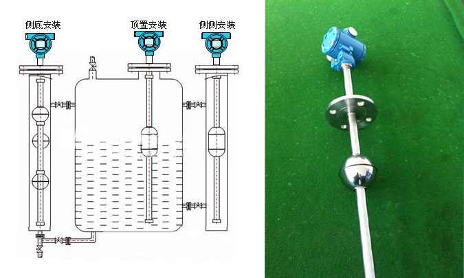 通過不同密度的浮球隨液面上下浮動,帶動相關(guān)連接件變化從而引起測量元件機械或者電子相關(guān)變量變化,由此獲得液位變化數(shù)據(jù)。浮球式液位計又分為多種安裝方式:有頂裝、底裝、側(cè)裝等,就量程來說側(cè)裝液位計zui小,但由于其在罐側(cè)安裝,可用于測量分界面液位,在線原料罐或反應(yīng)爐中使用較多。