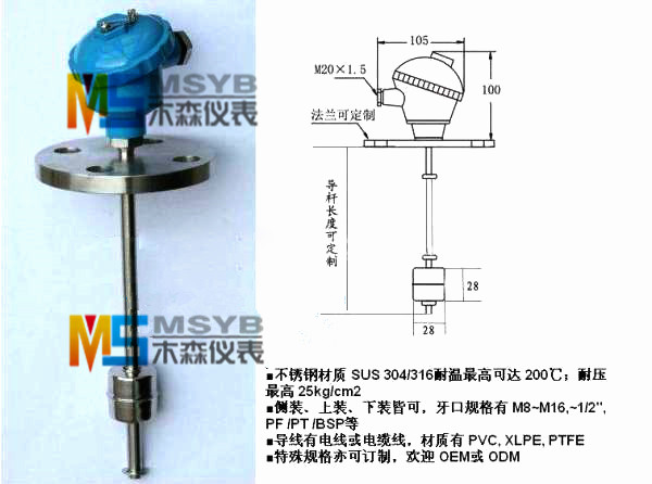 浮球液位計(jì)及浮球式液位控制器在工農(nóng)業(yè)中非常常見液位測量與控制儀表,其結(jié)構(gòu)簡單,安裝方便,指示精確,適合于各種液位測量場合。連桿浮球液位開關(guān)分為基本型和可調(diào)型。基本型出廠時已將液位開關(guān)的接點(diǎn)依據(jù)用戶要求調(diào)好,可以直接安裝使用。而可調(diào)型的開關(guān)接點(diǎn)則可以根據(jù)現(xiàn)場要求由現(xiàn)場操作人員進(jìn)行調(diào)整,使用方便、靈活。連桿式浮球液位開關(guān)分接線盒、連桿、浮球等部分。在不銹鋼連桿內(nèi)對應(yīng)每個控制液位點(diǎn)均裝有一個磁感應(yīng)開關(guān),浮球內(nèi)裝有只在某一個層面產(chǎn)生強(qiáng)磁的特殊磁束單元。浮球隨液位變化并作用于浮球磁感應(yīng)開關(guān)時(同一水平位置),接點(diǎn)動作并輸出接點(diǎn)狀態(tài)信號;當(dāng)液位下降沒有浮力作用于浮球時,浮球保持常態(tài)。浮球上下添加不銹鋼止位環(huán),以鎖定浮球的活動范圍。本文重點(diǎn)介紹污水處理常用液位計(jì)中連桿浮球液位計(jì)的工作原理及安裝。。
